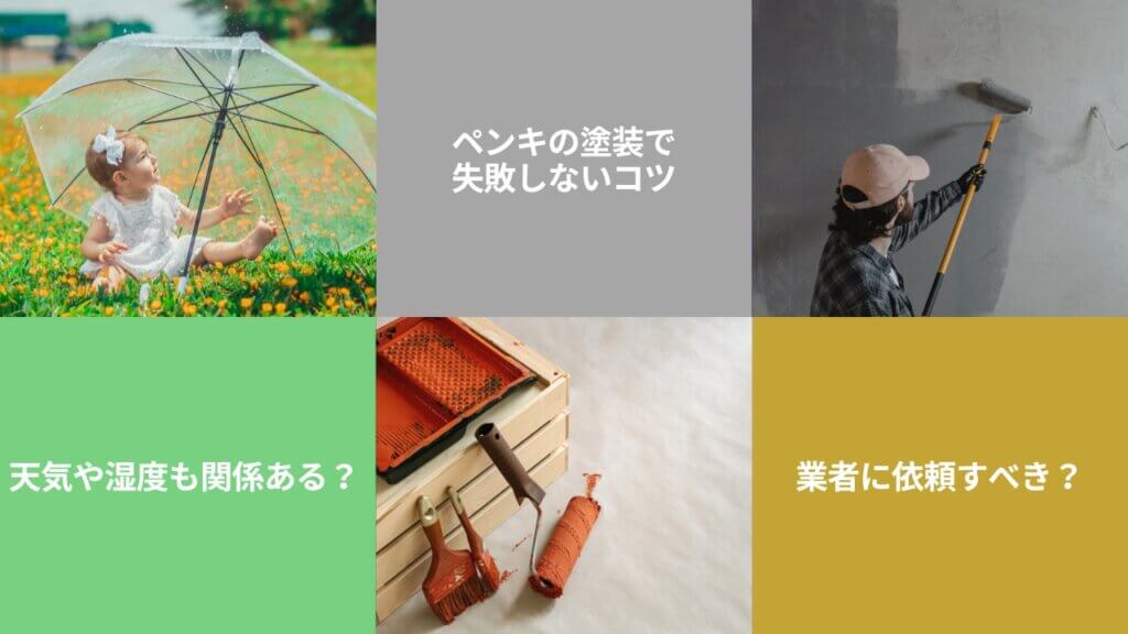 雨天時や湿度の高い日は、ペンキの乾燥が遅れ、仕上がりが悪くなる可能性があります。