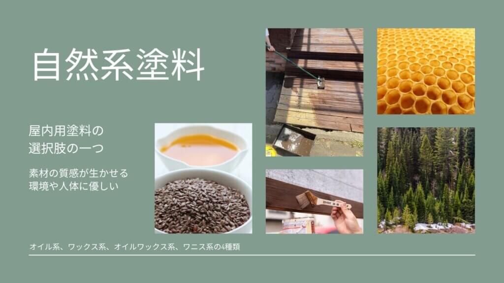 原料に石油系の樹脂や溶剤、合成顔料などが含まれず、環境にも人体にも優しい塗料として知られています。主に木材に使用されますが、塗料によっては壁紙や漆喰などに使用可能です。