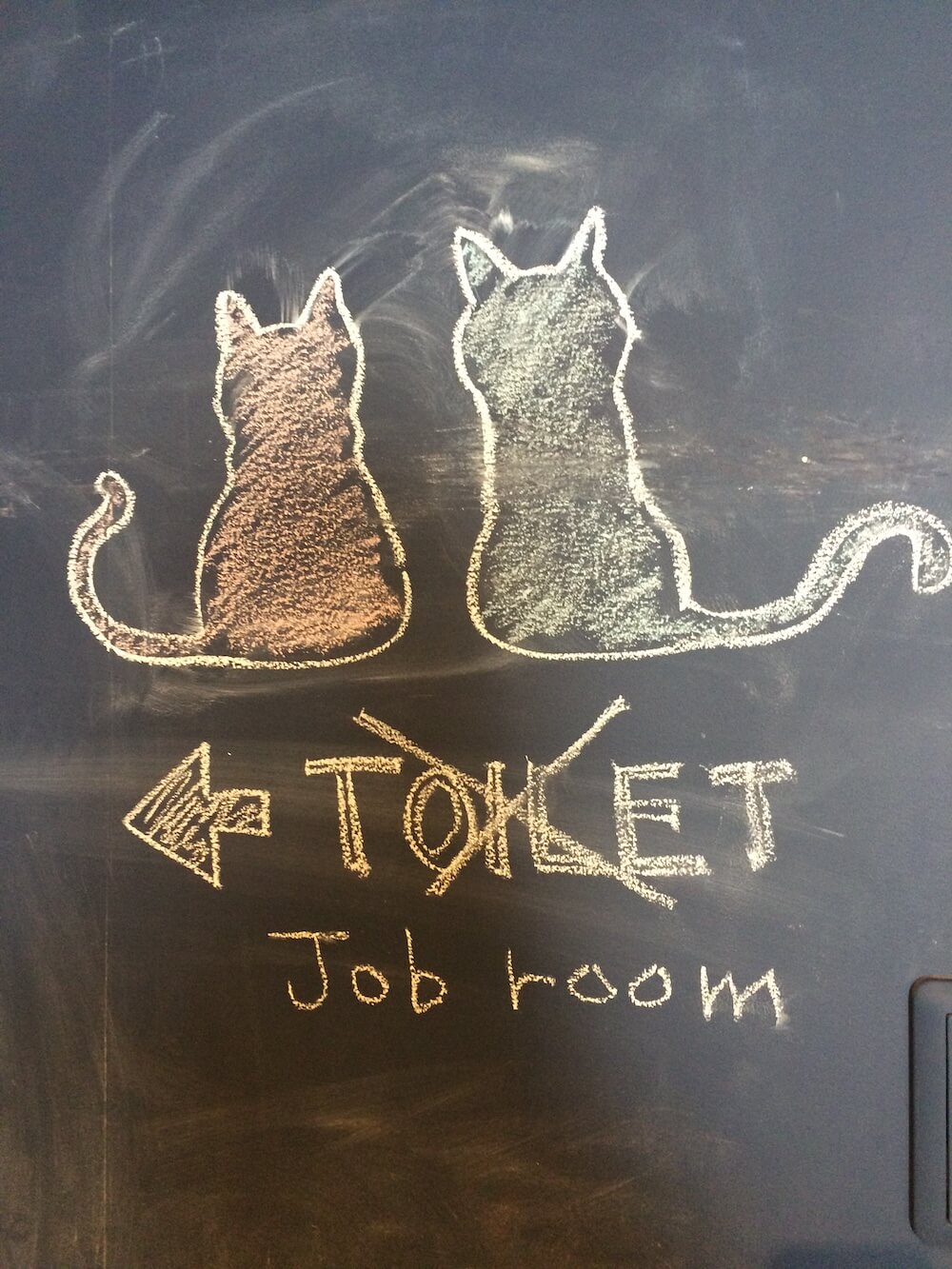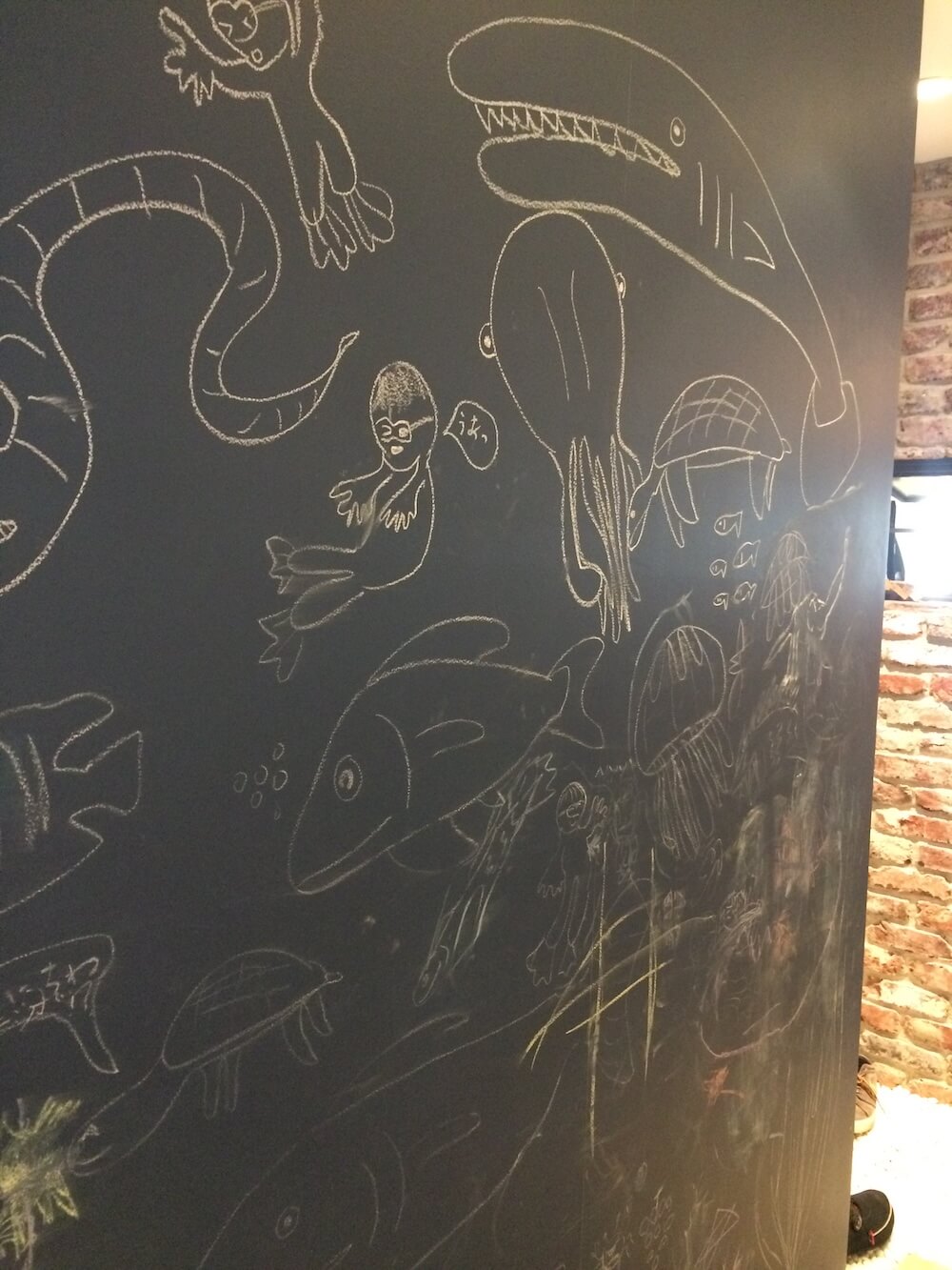 その後、担当の方を訪ねる機会があり念願のモデルルームへ。入り口から大きな黒板にいっぱいの落書きで気分が上がりました。