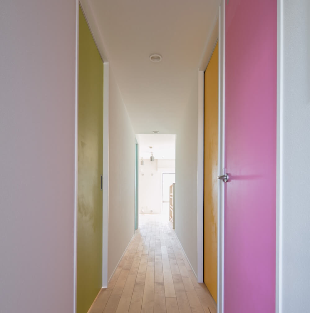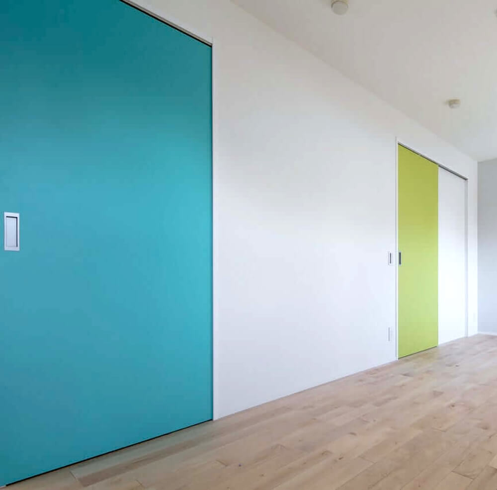 ドアをカラフルなチョークボードにしたいと思っていました。ドアそのものは、パナソニックのハレルドという店舗用の建具です。本来はタックシートを貼って使うものなのだそうですが、あらかじめ下地処理されていて塗装向きだということでした。